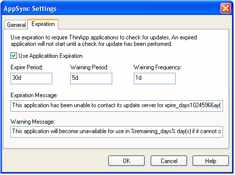 Before the expiration limit has been reached and a ThinApp application is started, it will try to connect to the Web server and check for a new version. If the connection fails, a message box will be shown. The default message is: