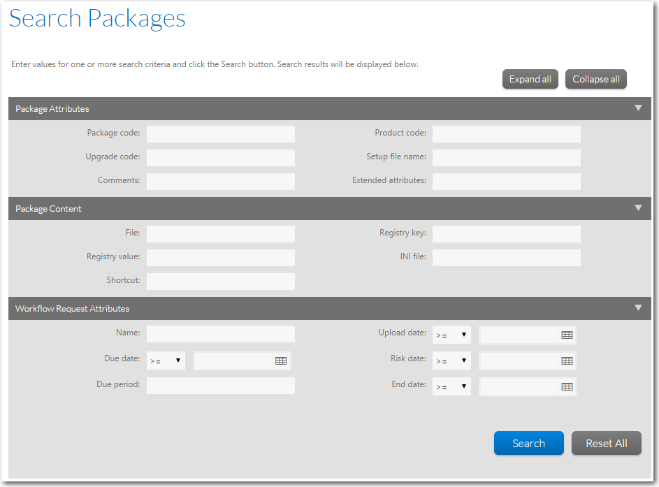 1. In the Search Packages area of the Search Packages page, expand the criteria category that you want to use by clicking the arrow. When all three categories are expanded, the following fields are available: