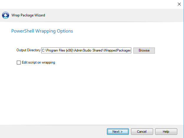 2. Specify the Output Directory, the location where the PowerShell-wrapped package will be stored. For more information on wrapping msi/exe packages to Wise script wrapped exes, see Wrap MSI/EXE Packages Using the Wrap Package Wizard.