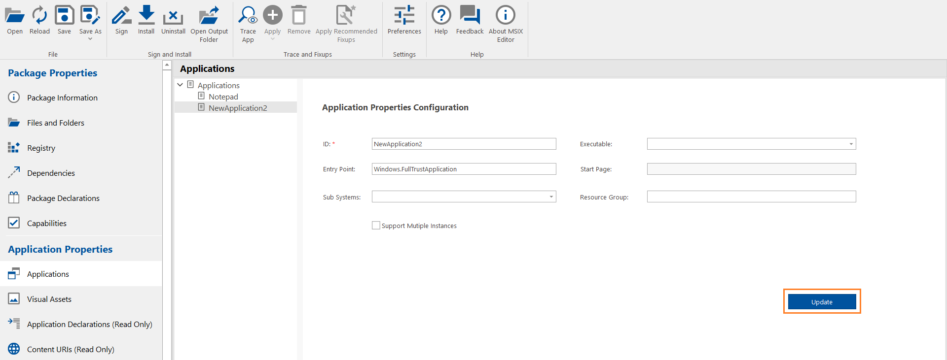 Enter the details in the respective fields and then click the Update button. For more information on Applications properties, see Applications View.