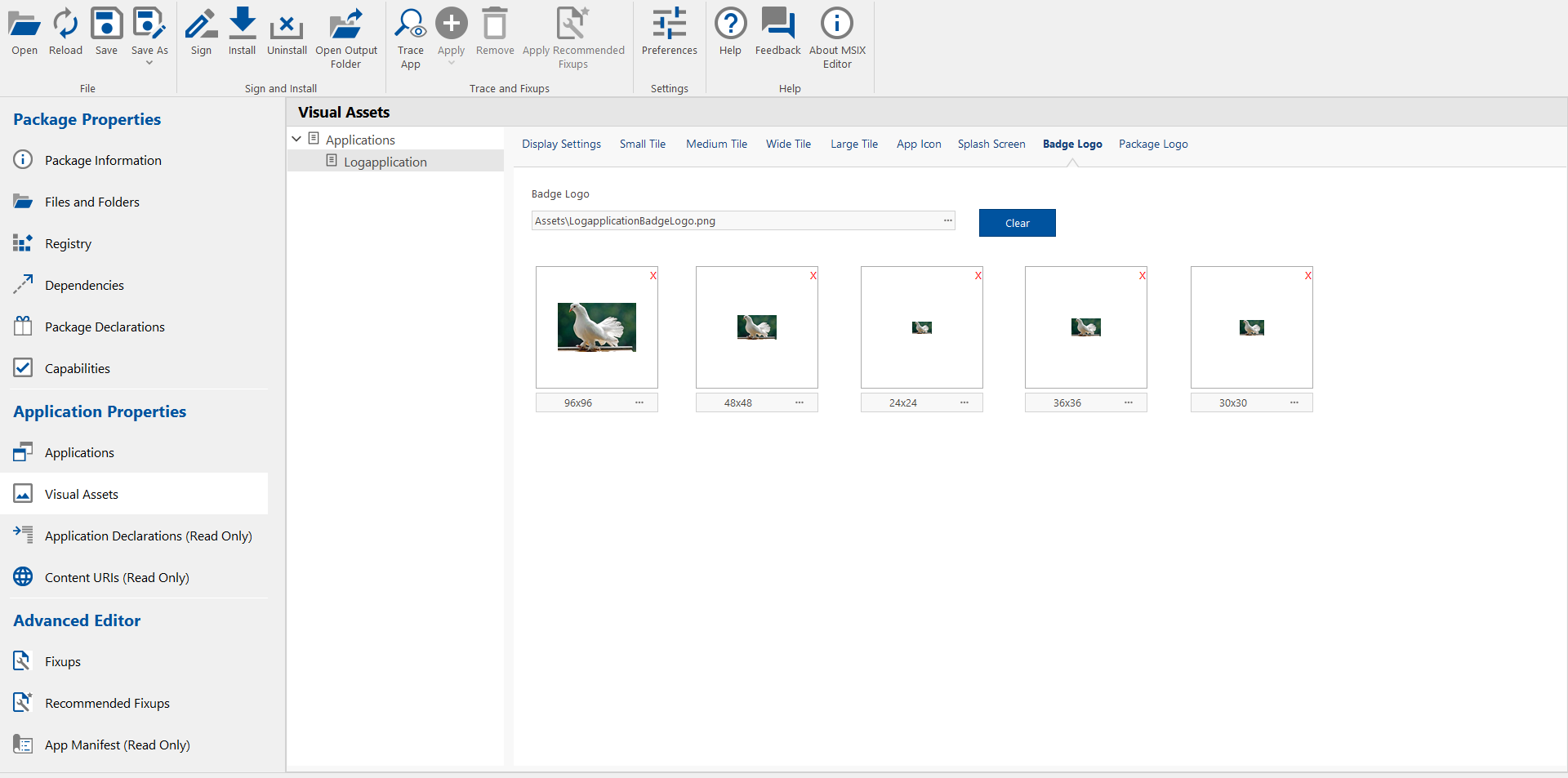 Visual Assets comprise of different tile sizes, application icon, package logo, splash screen and badge logo. Upon its installation, MISX surfaces on a Windows machine through these visual assets, for example as tiles and/or application icon on the start menu. Unlike traditional MSI icons, Visual Assets provide flexibility to specify different sizes of tiles and icons with different images and scales. The Visual Assets view enables you to view, edit and generate new visual assets for an MSIX package.
