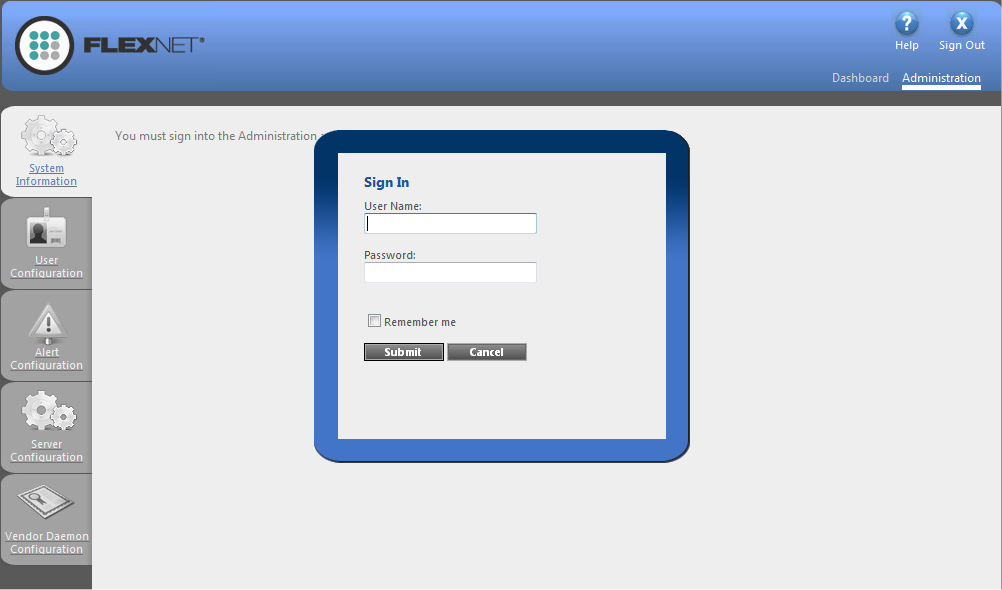 http://localhost:PortPortis the HTTP port number that is used to host the Web server; this is configured when the FlexNet Licensing Server software is installed. The default port number is 8090. -